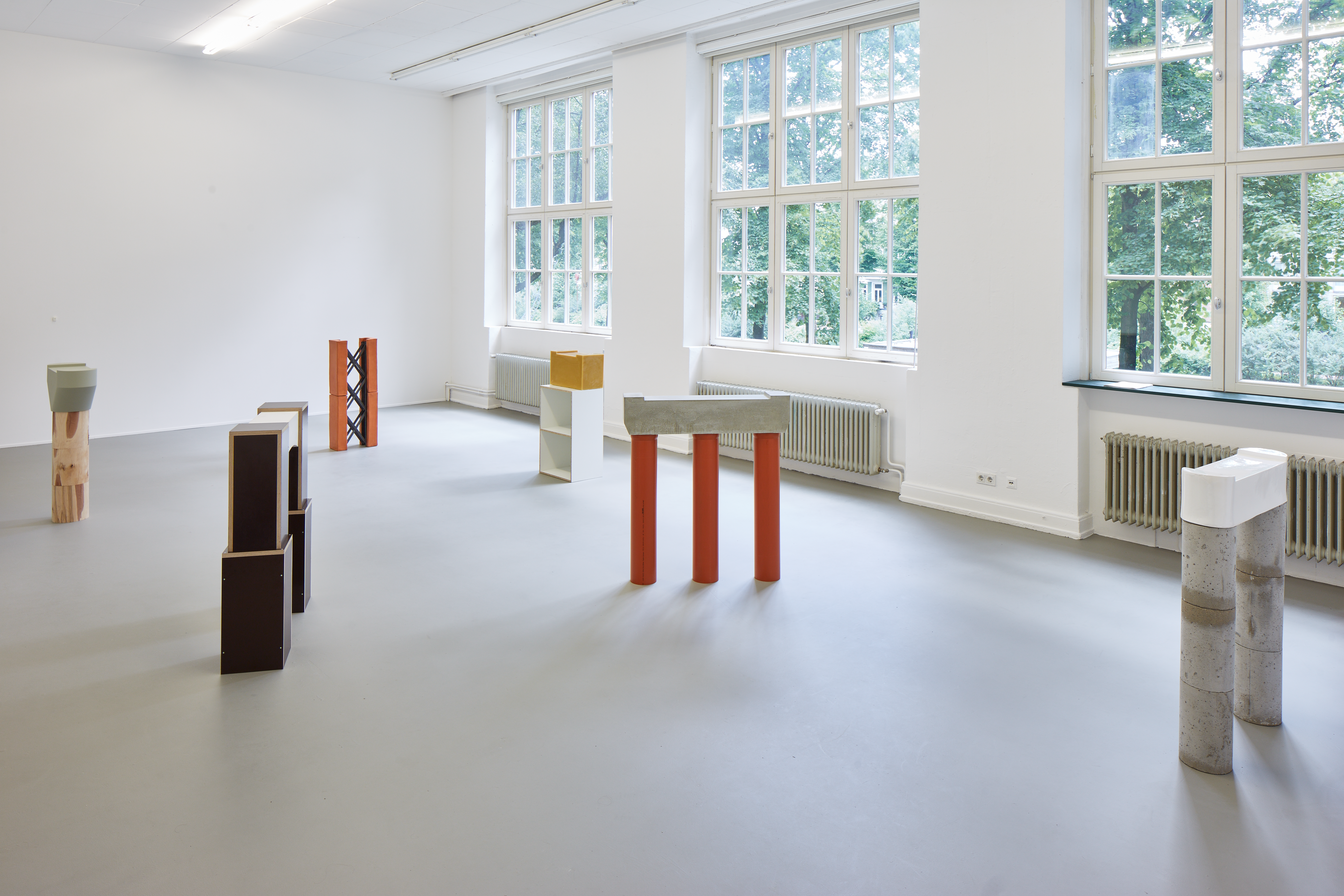 Each object assemblage draws in a human involvement through a depiction of familiar tools in temporary formations. Infrastructure, homeware and language sit waiting for the engineer, worker, student or mover to develop the design, complete the sentence, to pack, unpack, send or deliver — to use the objects. When the viewer encounters these works, their constructive attention4 combines with the pieces’ physical attributes, identifying and activating latent potential. To the information on material, placement, quantity and so on, the viewer adds their personal connotations, their existing experience and previous interactions, in order to mentally manipulate these ‘blocks’ and construct a narrative of use — whether past, present or future.