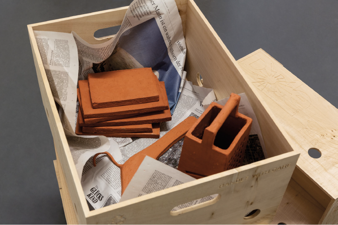 In the installation HANDLE WITH CARE, we catch the objects midway through moving. Half packed or unpacked banana boxes sit marooned on the exhibition floor, their irregular stacks typical of this sorting process. These crates are hand-carved from soft limewood sourced in Hamburg, Germany, where the work was developed, and lined with similarly local newspaper chronicling the days leading up to the ‘move’. Their cargo is a collection of homeware objects rendered into terracotta. These tools for living make their way between packaging and the bespoke, flatpack vitrine installed against the wall. In the process of moving house, the home is broken down into smaller parts, ready to be considered under new criteria and for function to be reassigned. In the packing boxes , the grater is no longer for food preparation and the books are not for reading: they are units for ballast and a wedge to stop the more delicate objects rolling back and forth. The object-components are able to travel in every sense as they negotiate amongst themselves during transit.