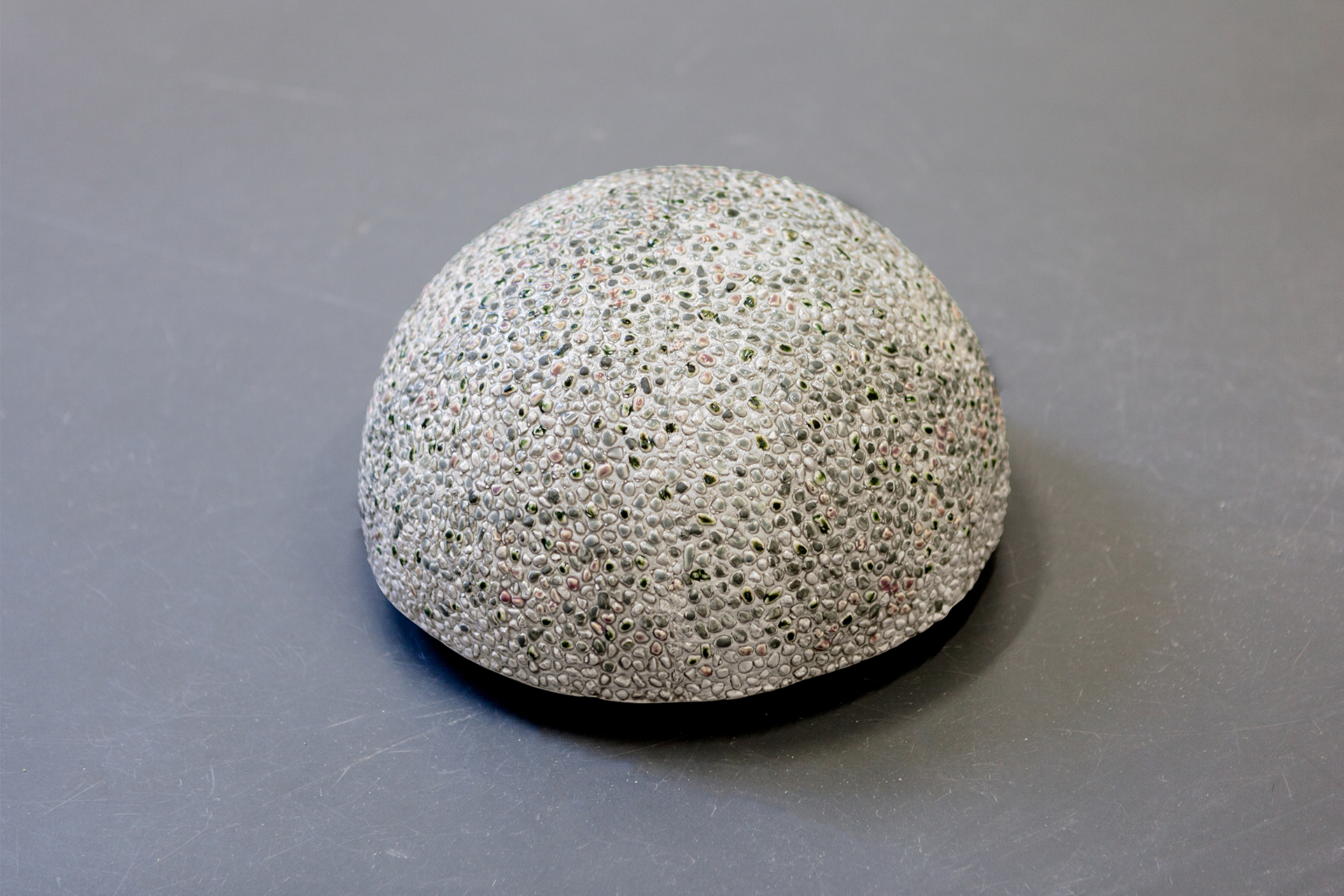 In imperatives, I have adopted the form of street bollards that guide our movement in public spaces. The original purpose of these objects is to prevent cars from entering pedestrian areas. The process of creating the sculpture involved reenacting the shape by manually placing gravel onto wet clay. This shape was then used to create a negative mold, which was subsequently cast in porcelain.